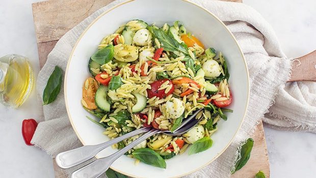 Deze pastasalade van orzo met tomaatjes, pesto en mozzarella is snel klaar en heerlijk als lunch op een warme dag of als bijgerecht bij de BBQ.