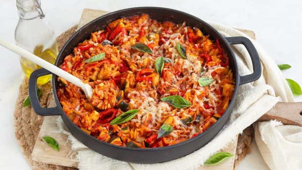 Een heerlijke ovenschotel met orzo, tomaat, courgette en paprika. Lekker gekruid en met geraspte Parmezaanse kaas bovenop. Je hebt deze ovenschotel voor 4 personen al in 25 minuten in de oven staan.