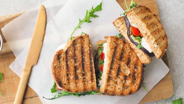 Een gezondere tosti gemaakt met volkorenbrood, gegrilde aubergine, zongedroogde tomaatjes en mozzarella