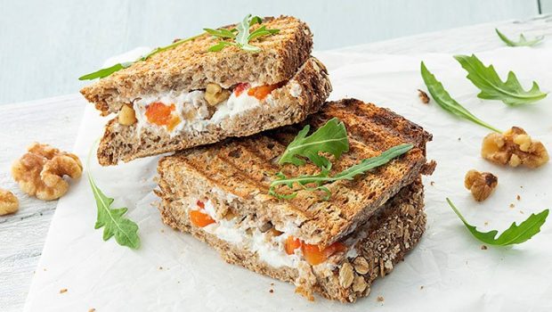 Met brood, geitenkaas, paprika en walnoot maak jij deze heerlijke tosti voor de lunch