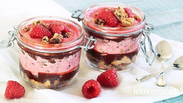 Met deze frambozen trifle met chocoladekoekjes kun je niet de mist in gaan.