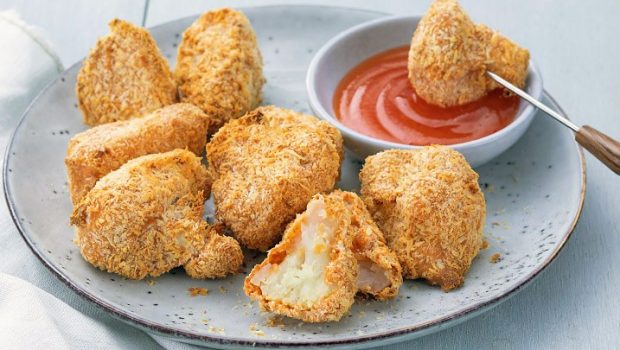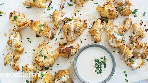 Lekkere stukjes bloemkool in een krokant en kruidig jasje, lekker als gezonde snack of borrelhapje