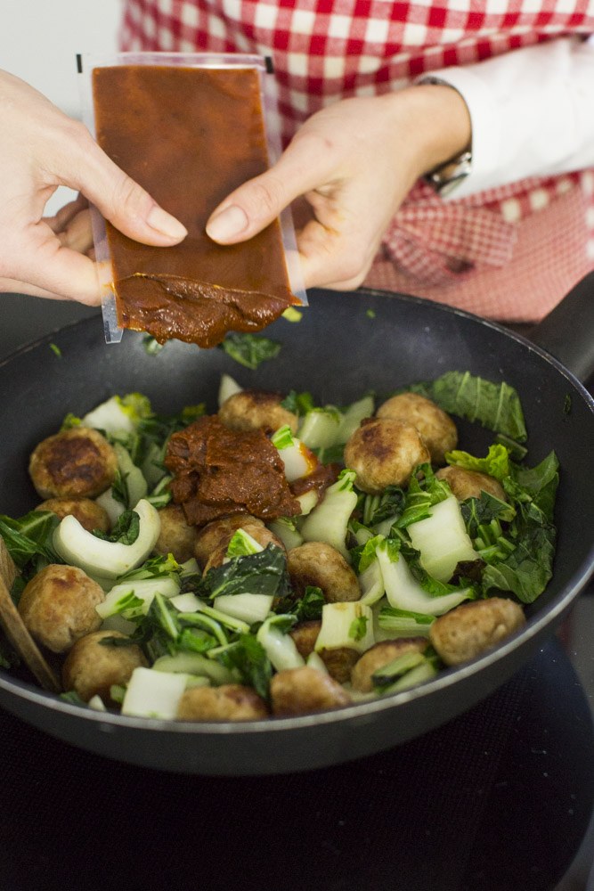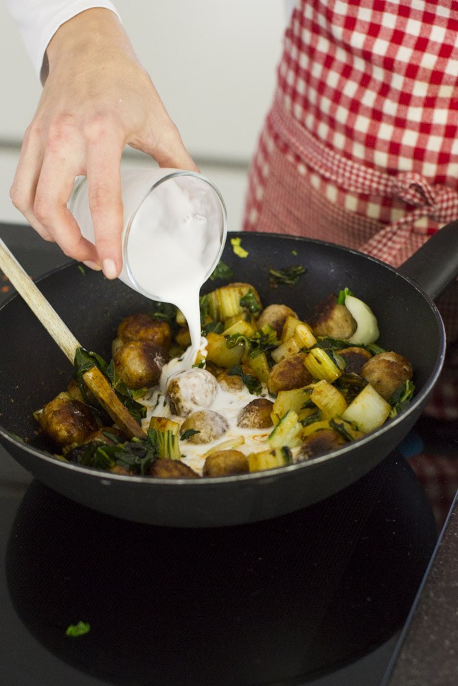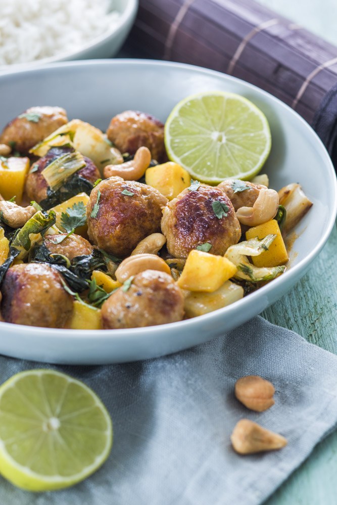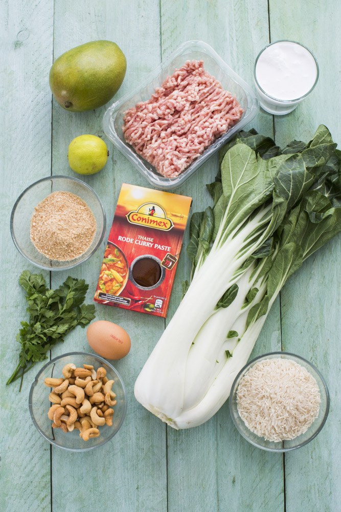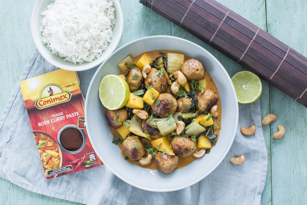Snijd de paksoi in reepjes. Voeg deze toe aan de balletjes en laat grotendeels slinken. Voeg de curry paste, de kokosmelk en 50 ml water toe en roer door elkaar. Laat een paar minuutjes zachtjes pruttelen. Schil de mango en snijd in stukjes en warm nog even mee in de saus. Serveer de rode curry met rijst, cashewnoten, koriander en besprenkel met wat limoensap.