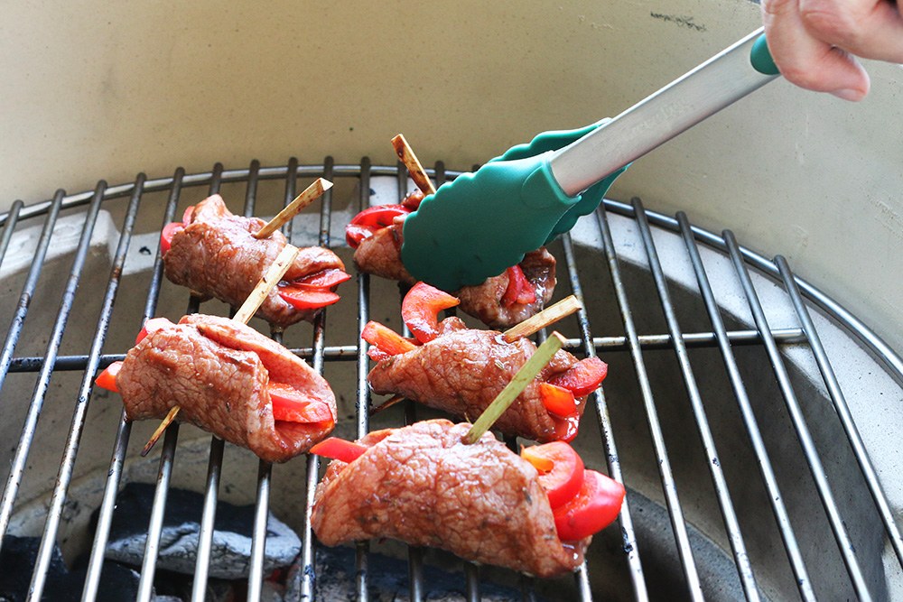 Gebruik je houten spiesen, laat deze dan van te voren een uur in het water weken.