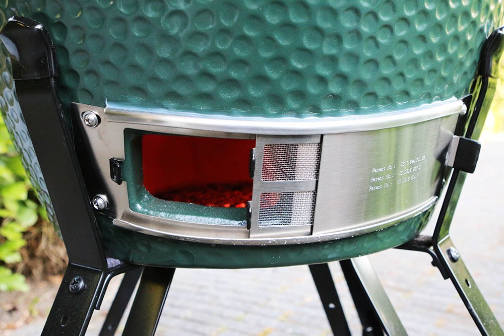 Hoe meer zuurstof er bij het vuur komt hoe hoger de temperatuur. En dat kan snel gaan met de Big Green Egg. Er zijn 2 luchttoevoeren, de onderste schuif (luchtregelaar) en de margrietschijf bovenop. Tijdens het verwarmen en bakken houd je de deksel zo veel mogelijk dicht. Wil je de temperatuur hoger dan zet je de luchttoevoeren open. Het grootste verschil maak je met de luchtregelaar onderin, hierdoor komt de lucht direct bij het vuur. Met de bovenste margrietschijf regel je de temperatuur nauwkeuriger. Als de juiste temperatuur is bereikt sluit je de schijf maar laat je de gaatjes openstaan, zo ontstaat er een constante luchtstroom. Op de handige grote meter zie je direct hoe warm de temperatuur is binnenin. Om de Big Green Egg na afloop te laten afkoelen doe je alle toevoeren dicht. Het vergt enige oefening maar wij hadden na 1 of 2 x wel onder de knie.