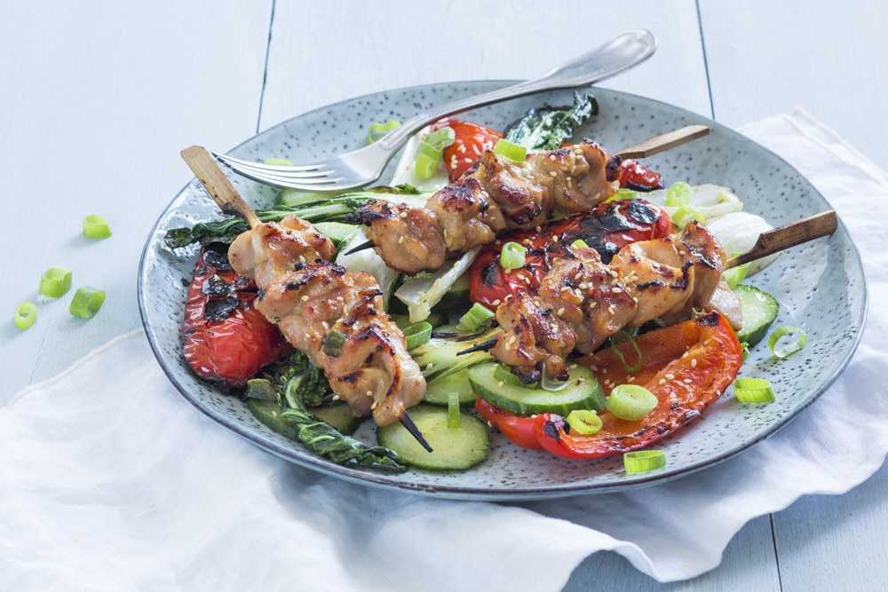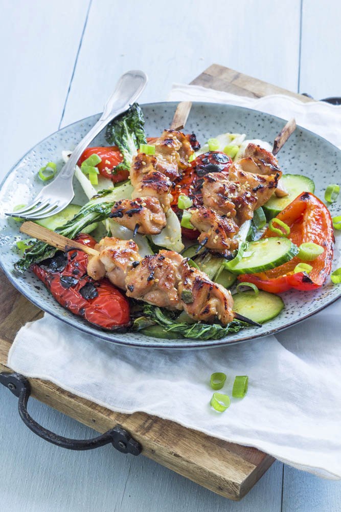 Leg de kipspiesjes op het rooster. Bak ze 3 minuutjes aan 1 zijde. Draai ze vervolgens om en leg ook de paksoi en de paprika er bij. Bak alles nog 5 minuutjes tot de kip gaar is. Snijd de komkommer in plakjes en verdeel samen met de geroosterde paksoi en paprika op een bord. Leg de kipspiesjes er op en bestrooi met wat ringetjes lente ui en sesamzaadjes.