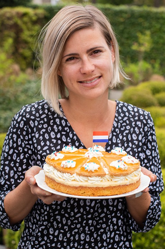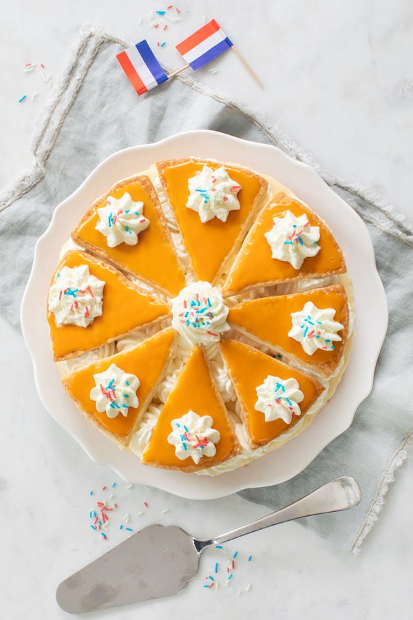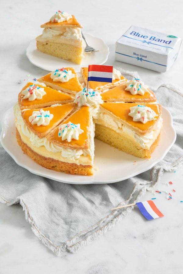 Voor de onderste laag van de taart heb ik gekozen voor een luchtige cake. Samen met de romige vulling en het knapperige bladerdeeg maakt dit een heel lekker geheel. De cake heb ik gebakken met o.a. bloem, suiker, eieren en Blue Band. Het pakje Blue Band is 100% plantaardig en een goed alternatief op roomboter. Ik gebruik nu al een tijdje margarine op mijn brood en om mee te braden in de pan. Ik bak nog wel dikwijls met roomboter, maar ik kies nu ook met bakken vaker voor een plantaardig alternatief. Bovendien bevat Blue Band 35% minder verzadigde vetten dan roomboter en ik ben heel erg tevreden met het resultaat en de smaak. Lees hier meerĀ info over Blue BandĀ en probeer ook eens deze leukeĀ Koningsdag oranje cupcakes met sinaasappel.