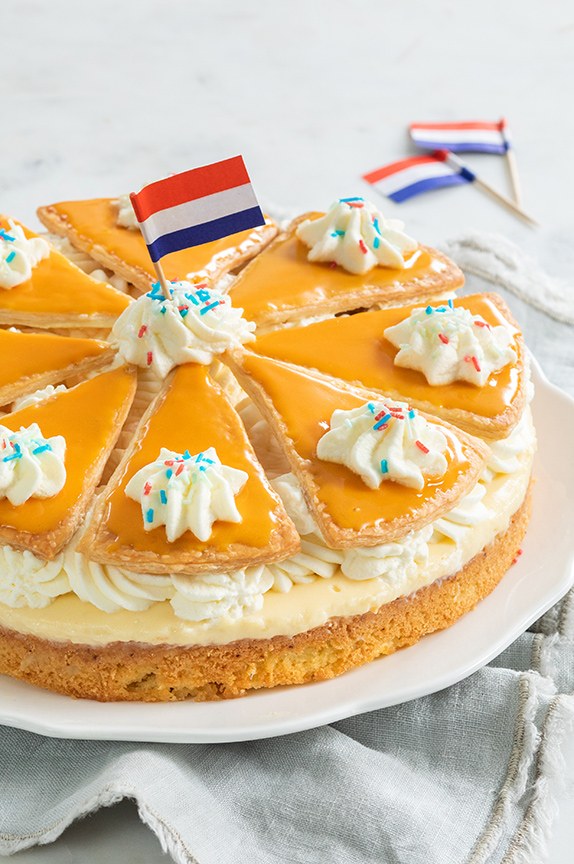 Deze tompoucetaart is ook leuk om op Koningsdag uit te delen in de buurt. Bijvoorbeeld aan je buurman of buurvrouw of verras je familie er mee. De taart kun je ook goed een dag van tevoren maken. Bewaar hem in de koelkast en haal hem een half uur voor het serveren eruit zodat de onderste laag cake op kamertemperatuur kan komen. OkƩ, nog ƩƩn allerlaatste tip die ik je wil meegeven is dat je de oranje glazuurlaag kan maken met gele en rode kleurstoffen, maar deze kun je ook vervangen door een klein scheutje oranje sinaasappelsiroop. Nu weet je alle tips en vind je hieronder het recept om aan de slag te gaan. Veel plezier en alvast een fijne Koningsdag gewenst.