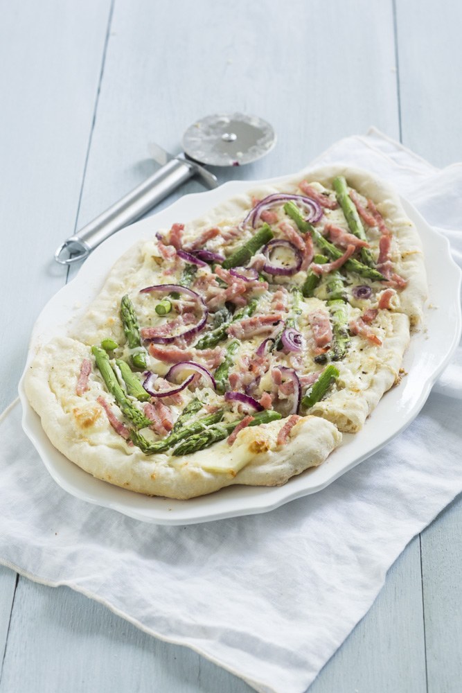 Kneed de bal deeg na het rijzen een keer door en verdeel in tweeën. Rol het deeg dun uit met een deegroller. Besmeer met een laagje crème fraîche. Verdeel de groene asperges (voorkoken is niet nodig) er over en de hamreepjes. Hak de ui in dunne ringen en verdeel over de flammkuchen en bestrooi als laatste met wat peper, zout en gruyere kaas.