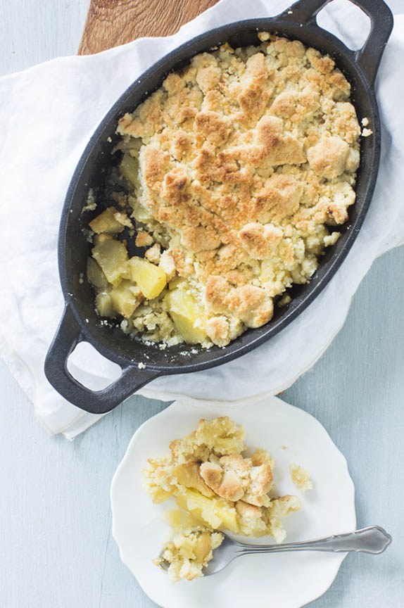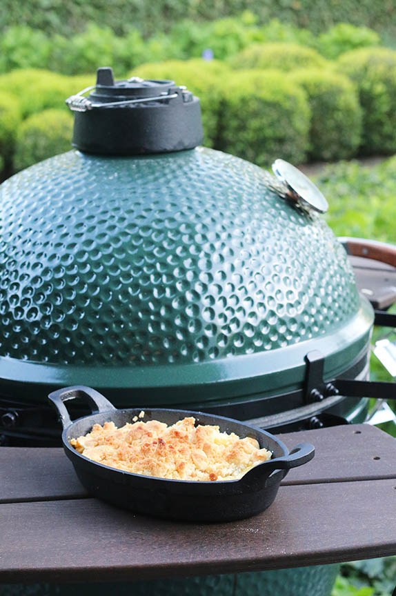 Verder hebben we nog een zoet gerecht bereid op de EGG, namelijk een ananas crumble. Hierbij geldt ook net als bij de Flammkuchen dat hij van alle kanten gebakken dient te worden, je wilt onderin lekker zacht fruit en bovenop een krokante laag kruimeldeeg. Ook dit ging perfect met de Big Green Egg. Het was even uitzoeken of mijn gietijzeren schaaltje en ovenschaaltjes er op konden maar dat was gelukkig geen probleem (dit kan per materiaal verschillen). Net als in de oven duurt het even voordat de crumble krokant en mooi bruin wordt, maar na 45 minuten was hij klaar en superlekker! De EGG is ook goedgekeurd om zoete baksels in te maken.