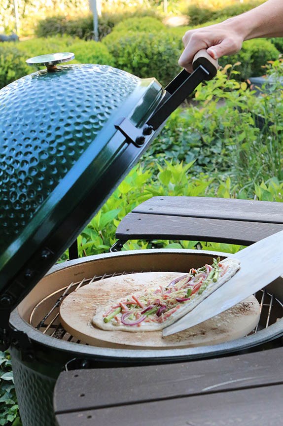 Zorg er voor dat de Big Green Egg op een temperatuur is van ca. 250 graden en dat de convEGGtor er in zit. Laat de pizzasteen alvast warm worden op het rooster. Leg dan de flammkuchen er op met behulp van de pizza steel en doe de deksel van de Big Green Egg dicht. Bak de flammkuchen 5 minuten en controleer vervolgens of hij gaar is en krokant. In totaal heeft de flammkuchen 5 tot 10 minuten nodig afhankelijk van de dikte.