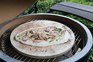 Een van de lekkerste dingen van de Big Green Egg vind ik pizza’s en Flammkuchen. Ze worden heel lekker krokant en krijgen een iets rokerige smaak, alsof ze in een steenoven gebakken zijn. Door de EGG dicht te doen en een convEGGtor te gebruiken creëer je een soort oven die ook vanaf boven verwarmt en de warmte isoleert waardoor hij van alle kanten gebakken wordt. Want je wil geen bodem die zwart is terwijl de topping nog niet gaar is. Maar daar was bij de flammkuchen van de Big Green Egg absoluut geen sprake, het was intens genieten! Bekijk hier ook het recept voor klassieke flammkuchen met spekjes en ui.