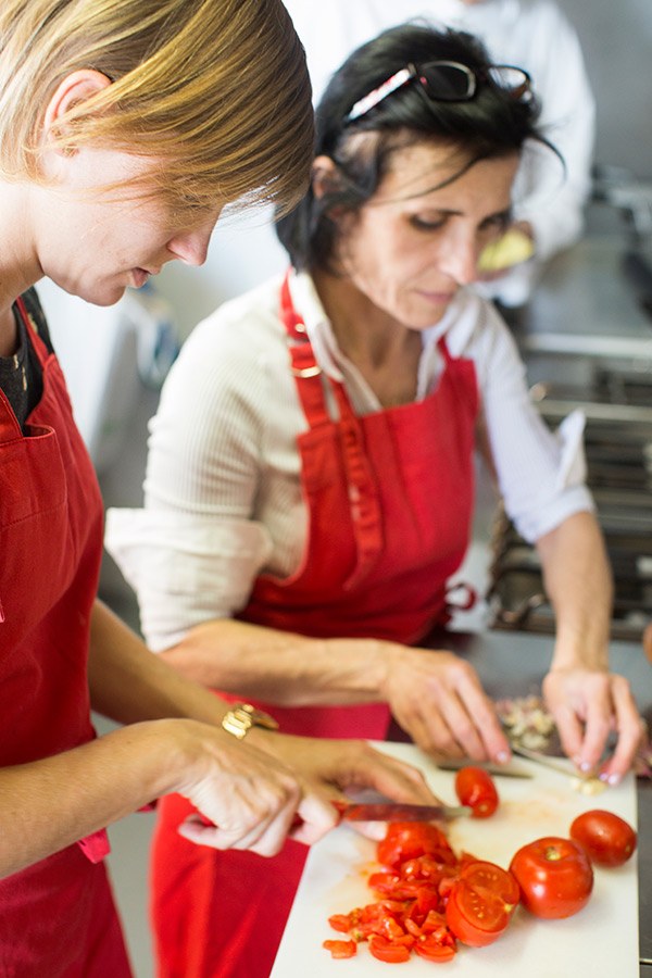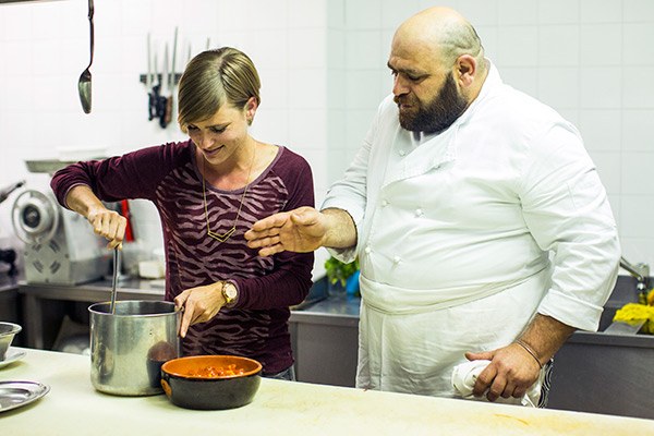 Daarna reden we naar zijn restaurant waar zijn vrouw ons in ontvangst nam en zijn moeder al klaar stond in de keuken. Het visrestaurant is al decennia in handen van de familie van Fabio. Toen gingen we aan de slag in de keuken om een soort vissoep te maken. Dit gerecht werd vroeger na het vissen aan boord gemaakt met de vis die overbleef. Ook dit recept is weer vrij basic maar heerlijk door de pure smaak van de ingrediënten. Nadat de vis uit de pan gegeten was werd de overgebleven saus gebruikt voor door de zelfgemaakte pasta. Toen volgde er nog een citroensorbet ijs en een soort laagjescake als dessert. Wat hebben we heerlijk gegeten bij Miramare, het was een groot feest! En ik heb nog nooit zo uitgebreid geluncht 🙂