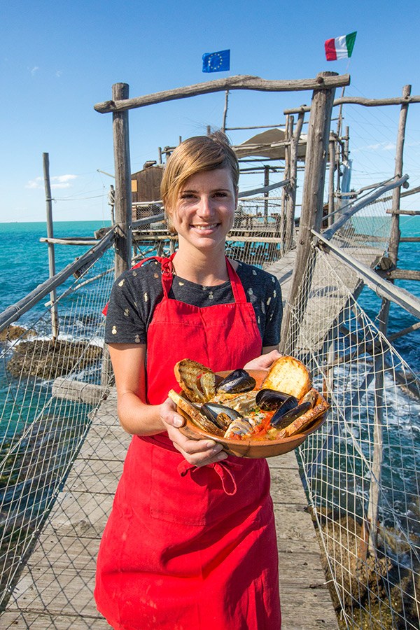 Deze dag stond er ook iets heel leuks op de planning. Na een wandeling in de natuur ging ik koken op de trabocchi Punta Tufano die we eerder hadden gezien aan de kust bij San Vito Chietino. Er stond een typisch visgerecht op het menu dat oorspronkelijk werd gemaakt door de moeders van de vissers met de vis die overbleef na de verkoop van de vangst. Er was een klein maar praktisch keukentje aanwezig waar in de zomer wordt gekookt voor 40 a 50 gasten.