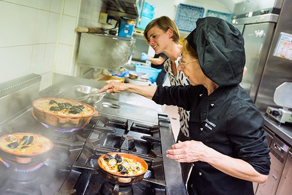 Maria begon eerst met het schoonmaken van de vis, deze was vlak daarvoor vers gevangen. Voor het vispannetje wordt er gebruik gemaakt van de vis die er op dat moment beschikbaar is. Er ging lekker veel olijfolie en wat knoflook in het pannetje en daarna de tomaat. Daar werd vervolgens de vis in gestoofd en op het laatst werden de mosselen toegevoegd. Wat hebben we weer gesmuld!