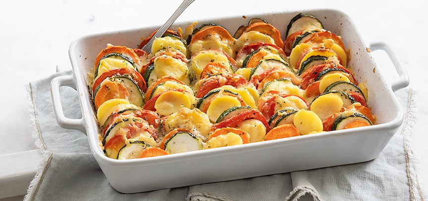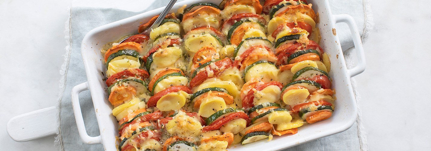 Heerlijke gratin uit de oven met plakjes courgette, wortel, tomaat en aardappel in room en gegratineerd met kaas.