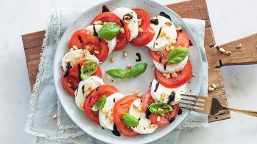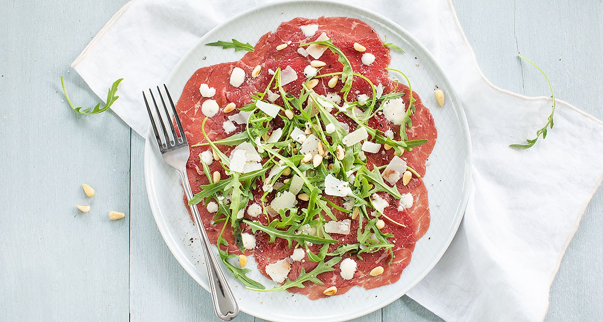Makkelijk en heerlijk klassiek Italiaans voorgerecht van carpaccio met Parmezaanse kaas, pijnboompitten, rucola en een heerlijke dressing