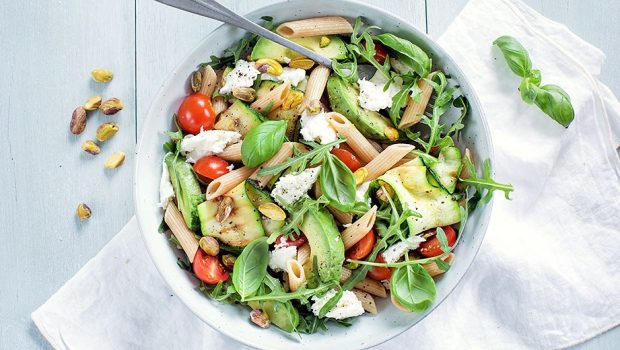 Een lekkere en gezonde pastasalade gemaakt met o.a. volkoren pasta en groenten zoals tomaatjes, courgette en avocado. Simpel en verantwoord!