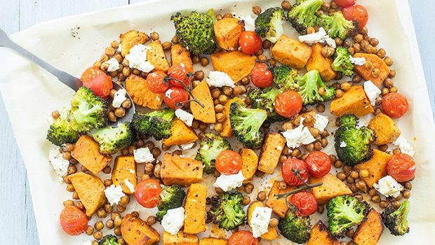 Gezonde en voedzame traybake zoete aardappel en broccoli. Een heerlijke bakplaat vol met kruidige stukken zoete aardappel, kikkererwten en broccoli, lekker en bovendien vegetarisch.