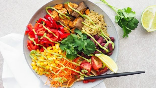 Heerlijke gezonde en vegan bowl met Mexicaans gekruide zoete aardappel, quinoa, groenten en avocadodressing