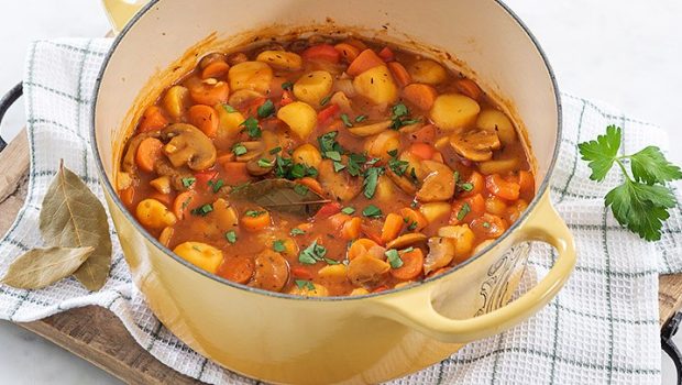 Heerlijke goed gevulde stoofpot zonder vlees, maar met champignons, wortel, paprika en aardappel in een kruidige saus.