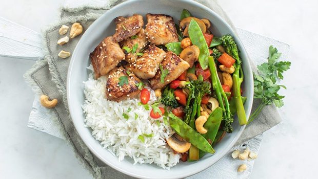 Lekker veel geroerbakte groenten geserveerd met Oosters gemarineerde stukjes vis, lekker met rijst