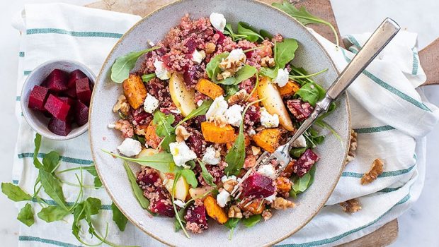 Lekkere goed gevulde maaltijdsalade op basis van quinoa met geroosterde zoete aardappel, geitenkaas en noten. Een mooi kleurrijk en gezond feestje op je bord.