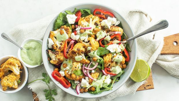 Goed gevulde maaltijdsalade van kruidige geroosterde roosjes bloemkool met een frisse dressing van avocado en limoen.