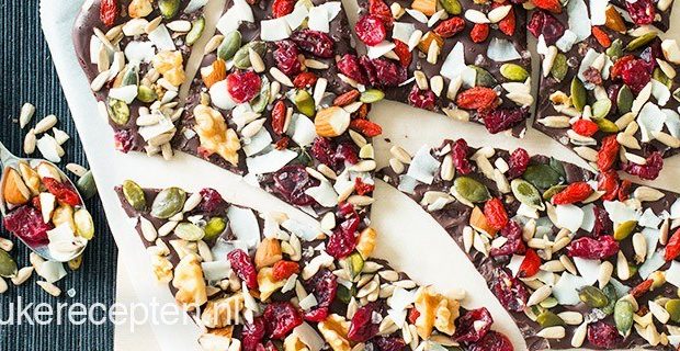 Snacken doe je verantwoord met deze rijkelijk gevulde pure chocolade met noten en superfood. Je hebt dit binnen een kwartiertje al gemaakt en je kunt heerlijk variëren met ingrediënten die jij het lekkerst vindt.