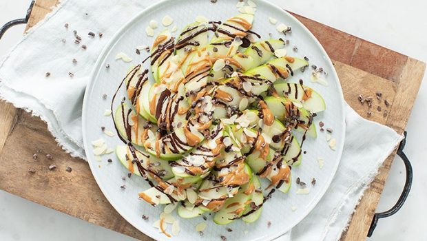 Zin in een gezond tussendoortje? Van deze variant van nacho’s, gemaakt met appels, pindakaas en chocolade kun je lekker door blijven eten
