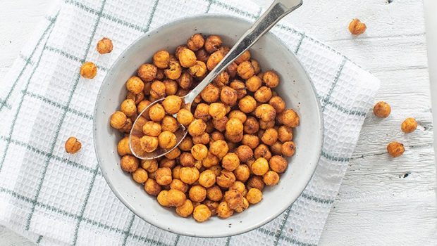 Krokante kikkererwten uit de oven met een licht pittig en kruidig laagje. Lekker als snack of over de salade of soep!