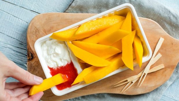 Lekkere en gezonde snack van in repen gesneden mango geserveerd met yoghurt en aardbeienpuree. Lekker voor kinderen, maar ook volwassenen.