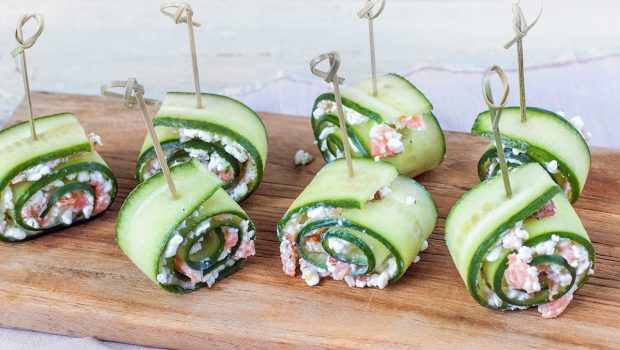 Deze frisse hapjes met komkommer, zalm en Hüttenkäse zijn een ideale traktatie voor je bezoek.
