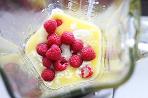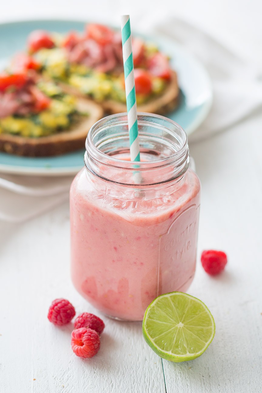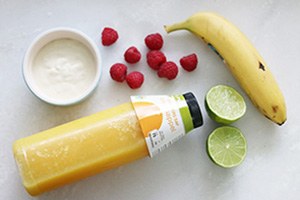 Doe voor de smoothie het verse sinaasappelsap in een blender. Voeg de banaan, handje frambozen, sap van 1 limoen en yoghurt toe en blend fijn. Lekker met een kop koffie of thee er bij.