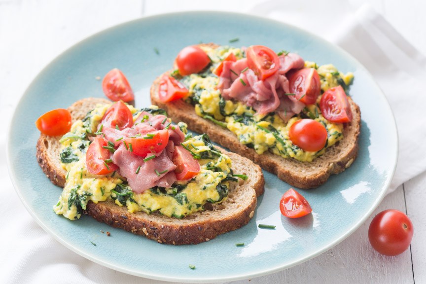 En als ik nog een paar minuten over heb maak ik nog een smoothie. Ideaal als je nog wat fruit of groenten hebt liggen dat op moet zoals banaan, aardbeien of een restje van de spinazie. Als we alle ingrediënten hebben verzameld kunnen we aan de slag. Hieronder deel ik het recept voor dit heerlijke ontbijtje met hét perfecte roerei. Want met deze tips krijg je gegarandeerd een smeuïg en zacht resultaat. Smakelijk alvast!
