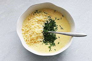 Verhit een koekenpan zonder olie of boter en rooster het brood een paar minuten tot het iets krokant begint te worden. Klop ondertussen de eieren los met de room, fijngehakte bieslook, geraspte kaas en een snuf peper en zout.
