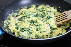 - Gebruik een houten of rubberen spatel en geen vork om het ei te roeren. Roer ook niet te fanatiek maar laat het ei even stollen en roer vervolgens los.