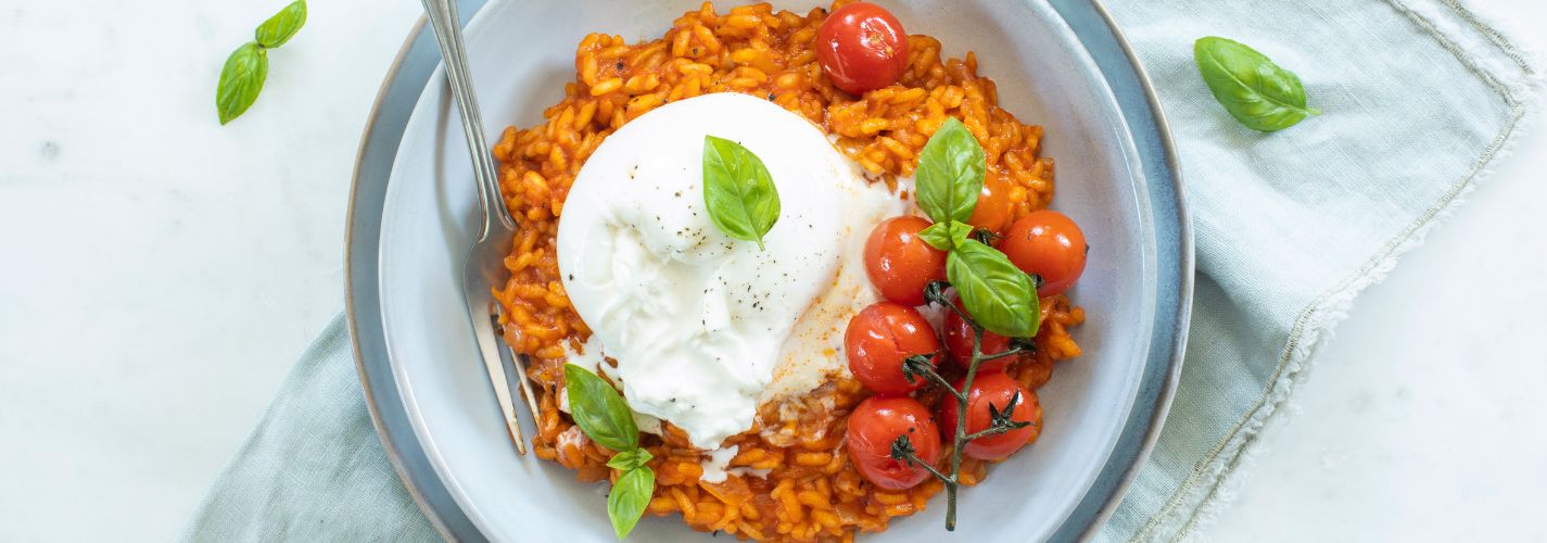 Heerlijke smeuïge risotto gegaard in tomatensaus en bouillon geserveerd met burrata en geroosterde tomaatjes