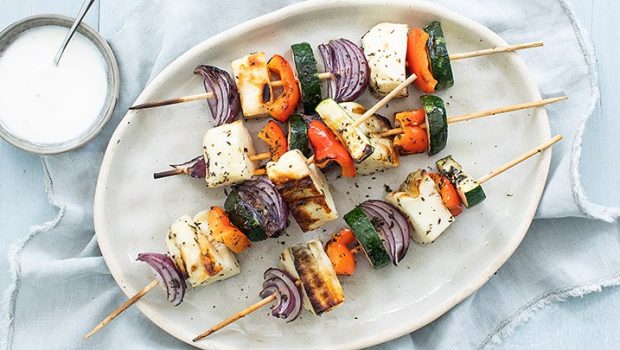 Deze vegetarische spies met halloumi kaas voor op de barbecue is ontzettend lekker. De kaas is perfect is om te grillen.