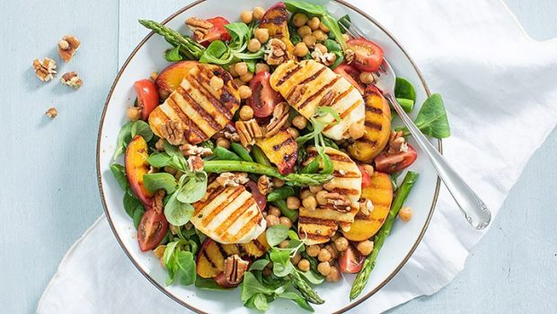 Lekkere lichte, maar vullende vegetarische maaltijdsalade met gegrilde halloumi kaas en perzik met een frisse en kruidige dressing.