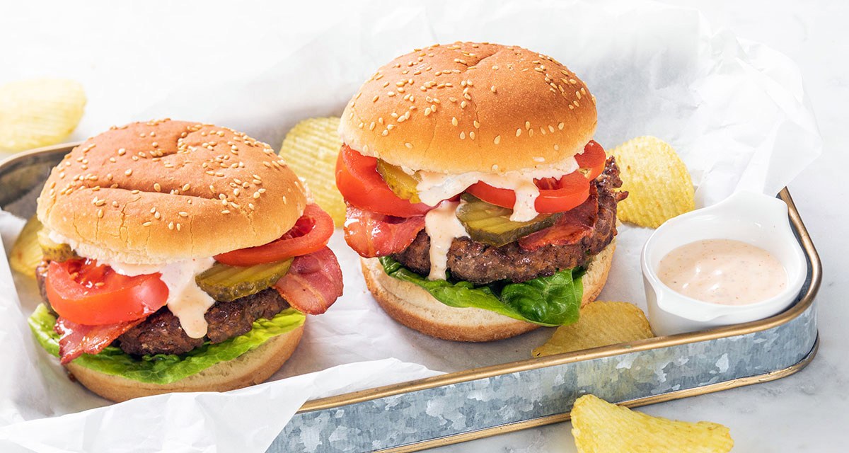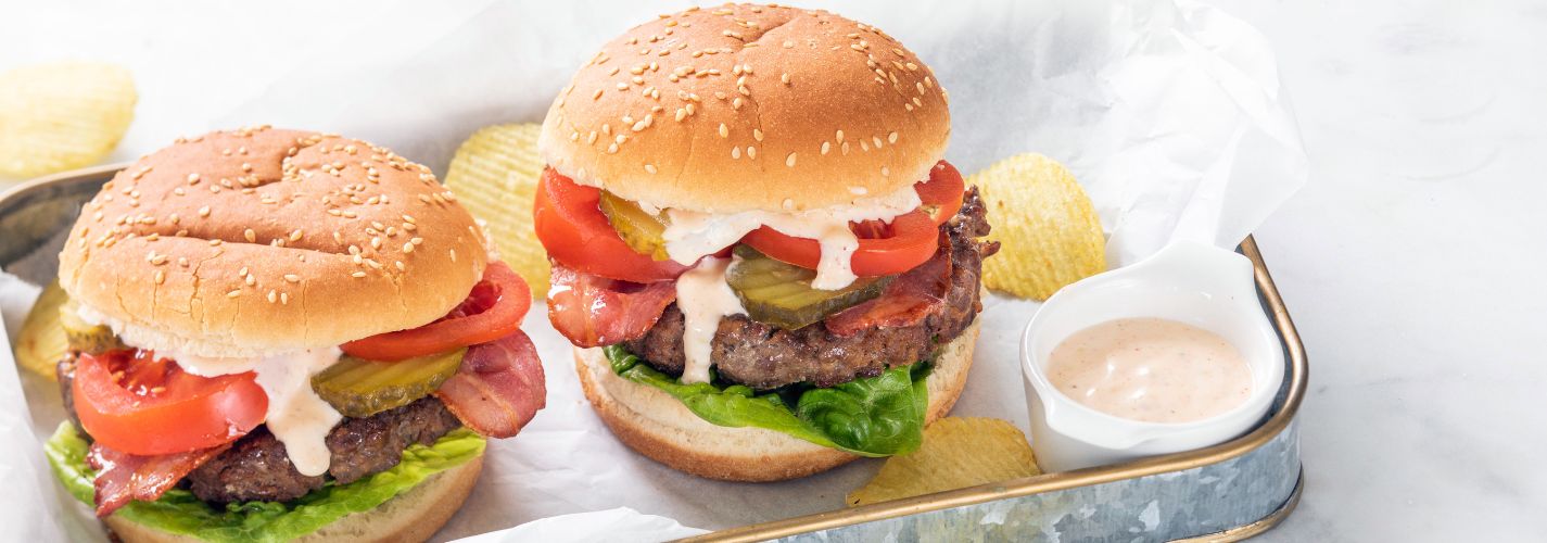 Een broodje hamburger op klassieke wijze, maar dan wel zelfgemaakt met heerlijke toppings zoals uitgebakken spek, tomaat en augurk. Lekker met homemade hamburgersaus.