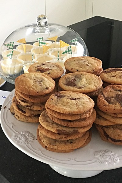 - Om de dag compleet te maken hadden Jaimy en ik ook een hele lading American chocolate chip cookies gebakken en mini cheesecakejes met Oreo. Deze zijn lekker om voor het hamburgerbuffet te serveren maar ook als toetje 🙂