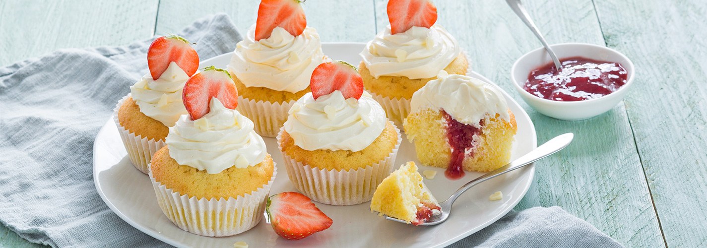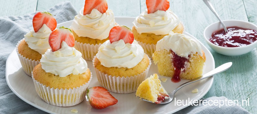 Deze romantische cupcakes met witte chocolade botercreme hebben een verrassing van binnen