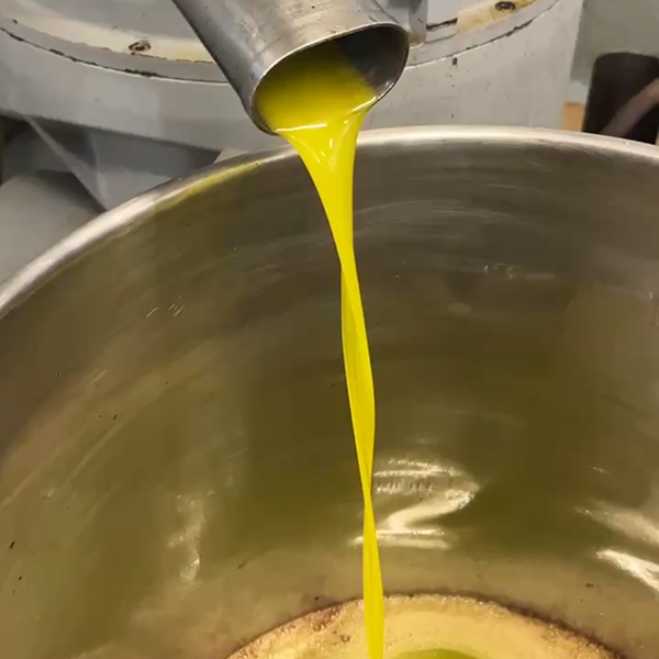 De olijven worden eerst vermalen tot een soort dikke pasta, en die pulp wordt daarna uitgeperst zodat de olie van het water en de stukjes vrucht worden gescheiden. Het resultaat van die eerste, pure persing proef je meteen: een vollere, fruitige geur, en een kleur die bijna richting vloeibaar goud gaat.