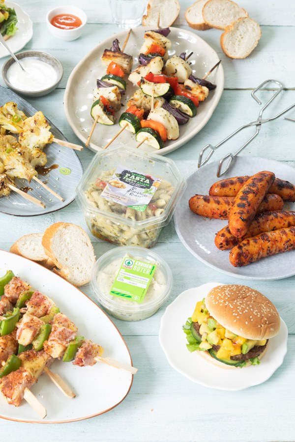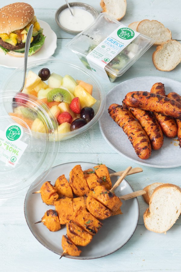 Voor vlees, vis en vega producten ga ik meestal voor ca. 400 gr per persoon. Dit komt neer op ongeveer 3 stuks per persoon, dus bijvoorbeeld een (vega)burger, een stuk zalm en een worst. Je hebt natuurlijk ook grotere eters die op 4 of meer stuks uitkomen, vaak zijn dit mannen dus als je gasten grotendeels uit mannen bestaat dan is het handig om extra in te slaan. Handig is om producten te kiezen die makkelijk in te vriezen zijn zoals burgers of vis mocht je nog iets over hebben.