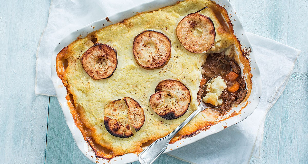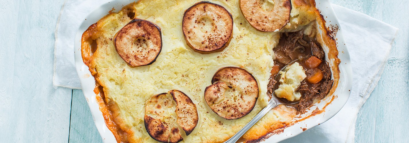 Van deze heerlijke traditionele ovenschotel met een laag stoofvlees, aardappelpuree en appel warm je zeker op!