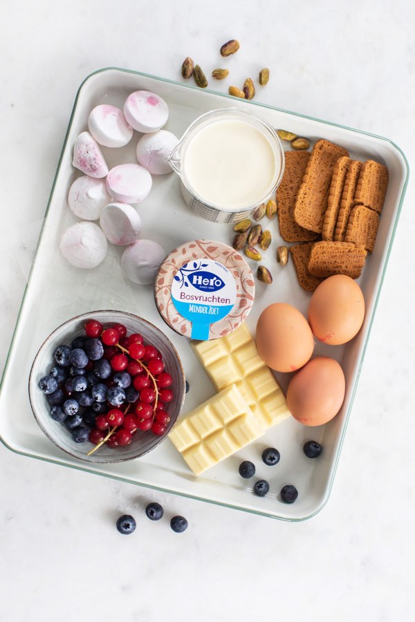 Verdeel een beetje van de witte chocolademousse over de bodem van de glaasjes. Verdeel hier een beetje jam over. Brokkel de koekjes en meringue grof en verdeel een beetje over de jam samen met wat fruit. Herhaal de lagen witte chocolademousse, jam, koekjes, meringue en fruit nogmaals. Garneer de trifle met wat fijngehakte pistache. Laat de trifle een uurtje opstijven in de koelkast. Bereid maximaal 3 uur van te voren.