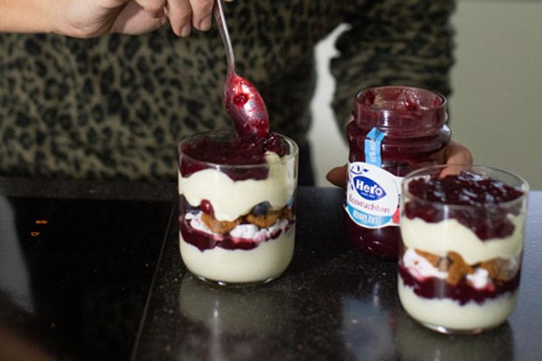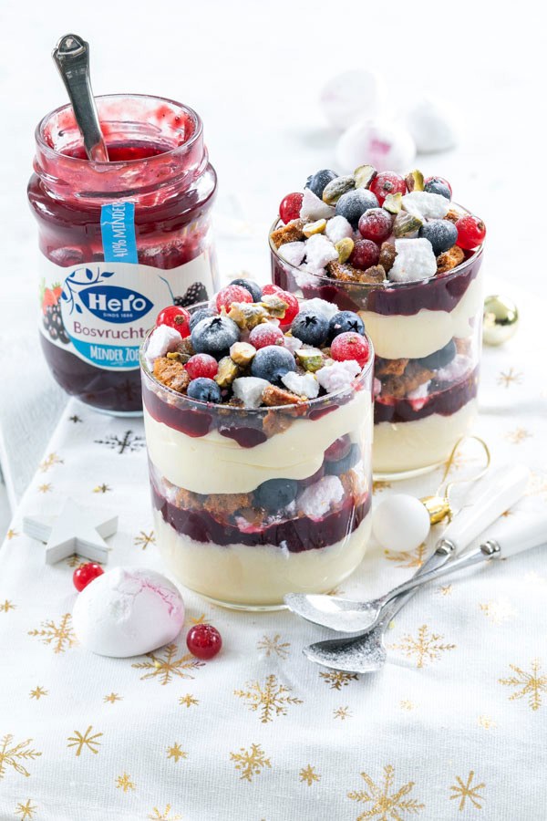 Een trifle bestaat uit verschillende laagjes en is het lekkerst als deze verschillende smaken en texturen heeft. Mijn trifle bestaat uit laagjes zelfgemaakte luchtige witte chocolademousse, krokante meringue schuimpjes, koekjes en frisse fruitige jam. De meeste ingrediƫnten zijn erg zoet, daarom heb ik als jam gekozen voor Hero Minder Zoet Bosvruchten Jam. Deze jam bevat 40% minder suiker en is lekker fris en fruitig en houdt het toetje goed in balans. Bovendien proef je de fruitsmaken zoals aardbeien, frambozen en bramen goed terug in de deze Hero Minder Zoet Bosvruchten Jam waardoor hij ideaal is om te gebruiken bij toetjes, taarten en cakes. Maar de jam is natuurlijk ook gewoon lekker op brood of cracker. Benieuwd wat je nog meer kan met jam? Kijk dan op de Hero Fruit Studio.