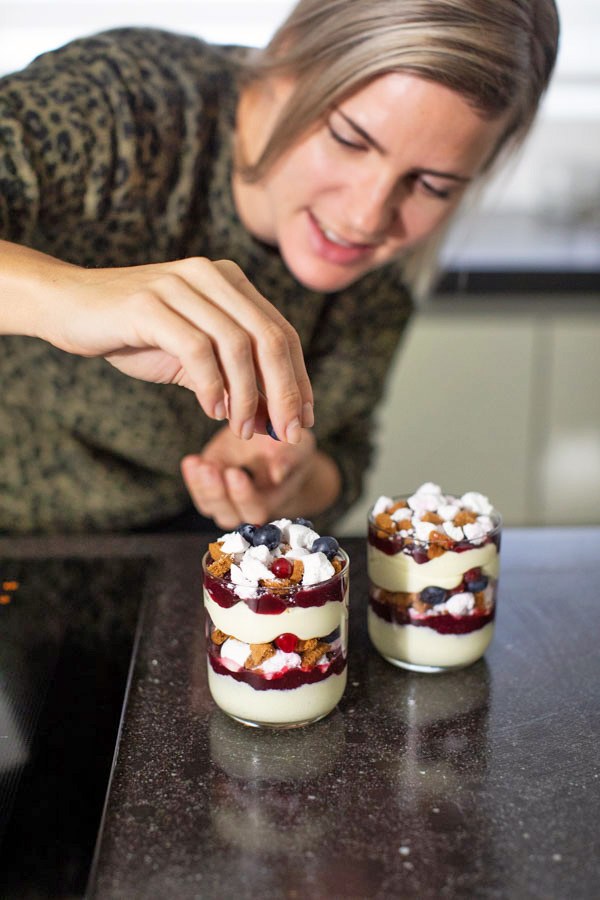 Maar met een klein gezelschap Kerst vieren betekent niet minder lekker eten. Je kunt nog steeds een feestje maken van het diner met een glaasje bubbels, voorgerecht, hoofdgerecht en nagerecht. En voor dit laatste heb ik een hele lekkere suggestie namelijk deze trifle met witte chocolademousse, meringue en jam.
