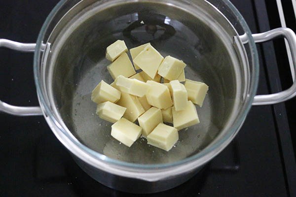 - Zorg dat het water in de pan niet kookt, het hoeft alleen maar warm genoeg te zijn om de chocolade te smelten. Als de witte chocolade te heet wordt dan wordt hij korrelig en hard.
